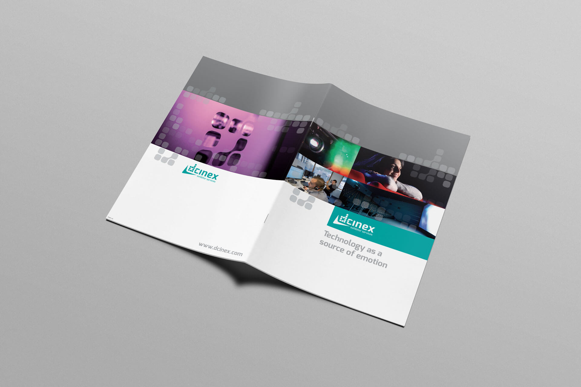 dcinex™, a service provider for digital cinema (integrating and financing projection equipment, content management, postproduction, digital laboratory, distribution, etc.), needed three brochures, each one presenting one of their domains of expertise. Assigning one primary colour used in cinema to each project made sense immediately.
